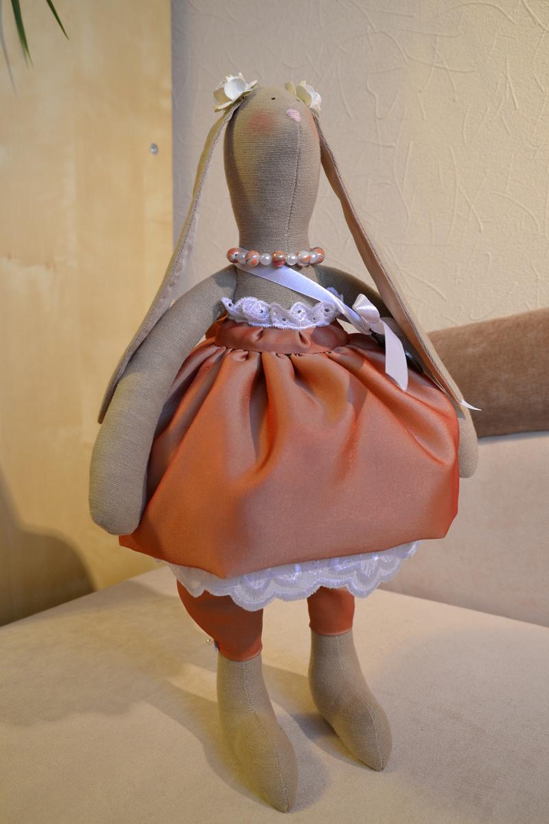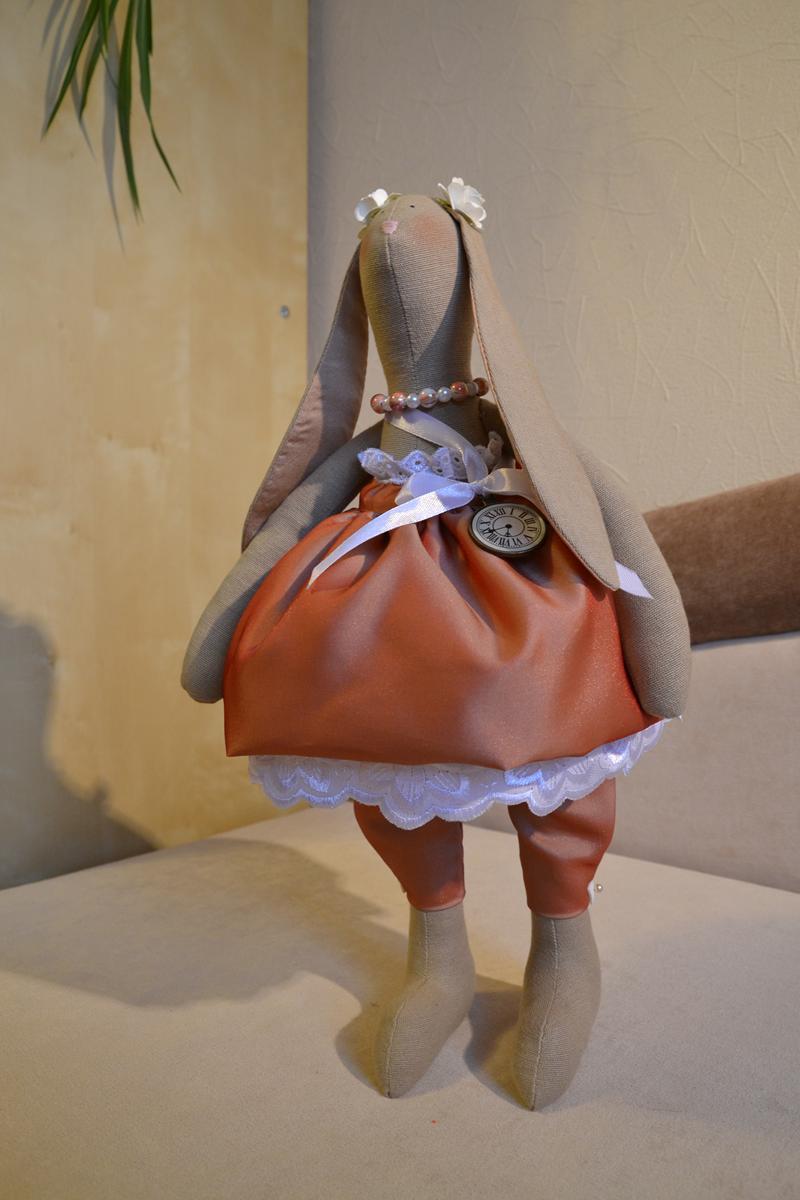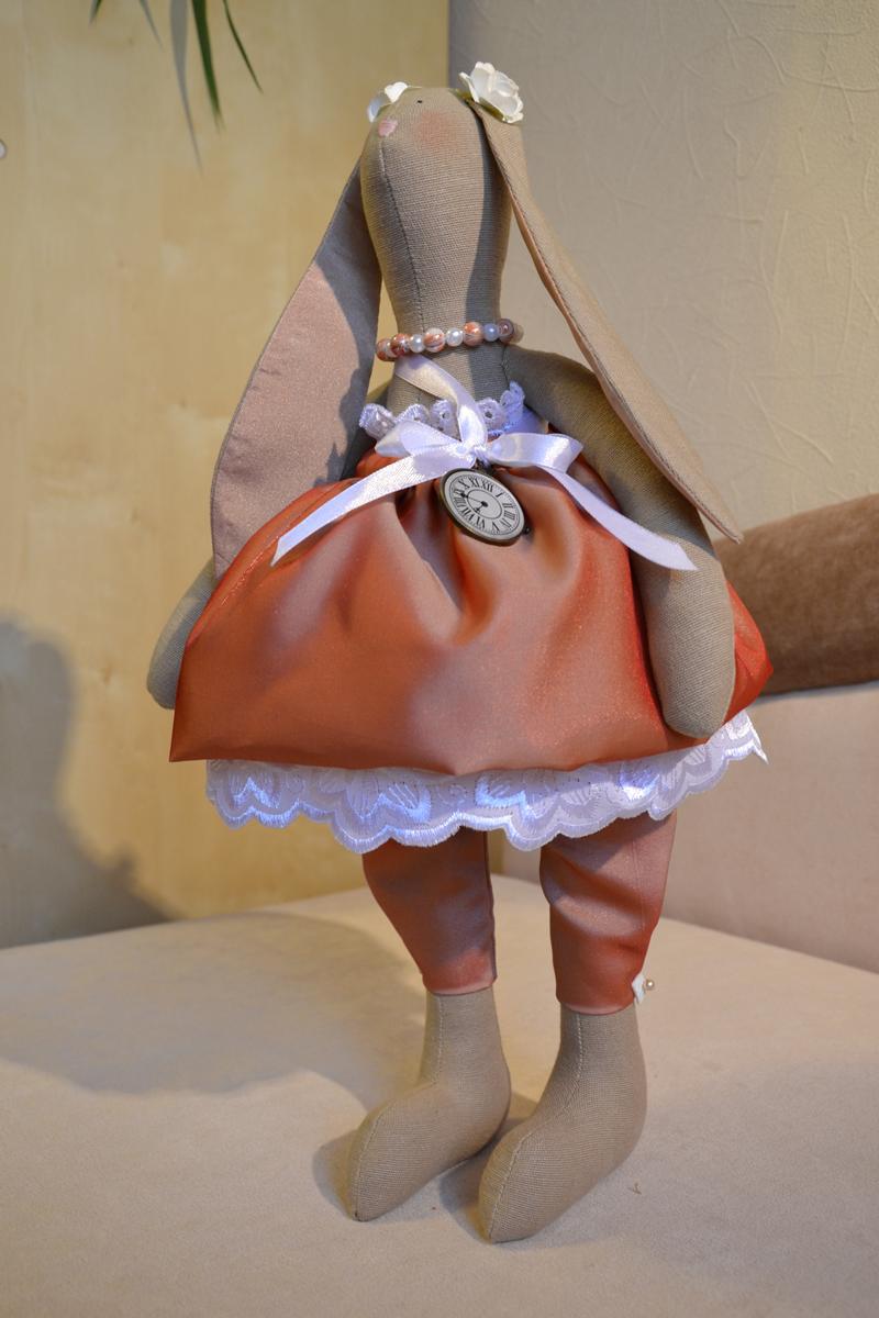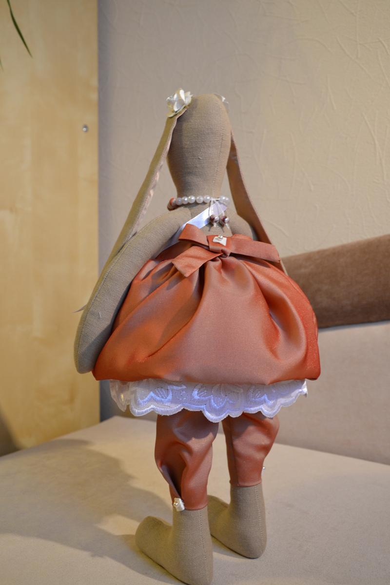 Карамелька - большая зайка, практически 35 см. Платье из парчи, кружевной подьюбник, бусики, часики - просто модница!