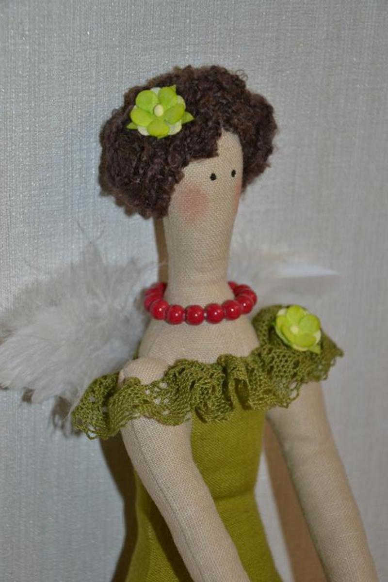 Это яркая очень большая феечка, ее рост 48 см. Сама феечка и ее наряд сшиты из льна и хлопковой ткани, кружево из льна, крылышки из настоящих перышек. Эта брюнетка с яркими бусиками всегда будет создавать Вам хорошее настроение.