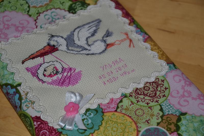 Это яркая записная книжка из 100% хлопковой ткани, для оформления использована узор вышитый крестом на белой канве. Сама вышивка считается своеобразной метрикой, так на ней можно вышить имя малыша, его рост и вес при роддении, дату роддения. Ежедневник предназначен для записей мамы о малыше, его росте, первом зубике, первом слове и т.д. Есть забавная закладочка с мишкой на шелковой ленточке.